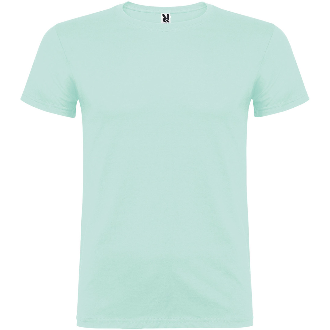 Tričko s krátkym rukávom a s dvojvrstvovým výstrihom z elastanu, vyrobené z trubicovej tkaniny, pre dospelých. Zosilnené kryté švy v golieri. Odnímateľný štítok. Model meria 190 cm a má na sebe veľkosť L. Jednolícny džersej 100% Bavlna, 155 g/m2.