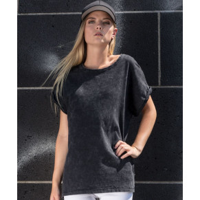 Dlhší strih, voľnejší strih, farbené pigmentom, široký rebrovaný okrúhly výstrih, presahujúce ramená, dvojité švy na leme, špeciálna úprava na dosiahnutie opraného vzhľadu – tento proces vedie k farebným odchýlkam, neutrálny veľkostný štítok, prateľný na 30 °, nemožno sušiť v sušičke.
