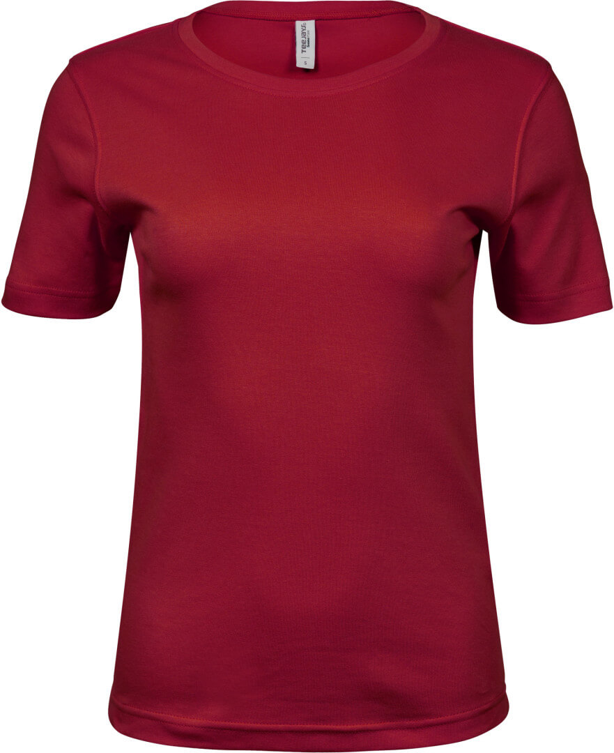 Vypasovaný strih, úzko lemovaný kulatý výstrih s elastanom, dvojité švy, vysoko kvalitný interlock z bavlny s dlhými vláknami, právo v silikóne pre veľmi hladký dotek, pratelné na 60°