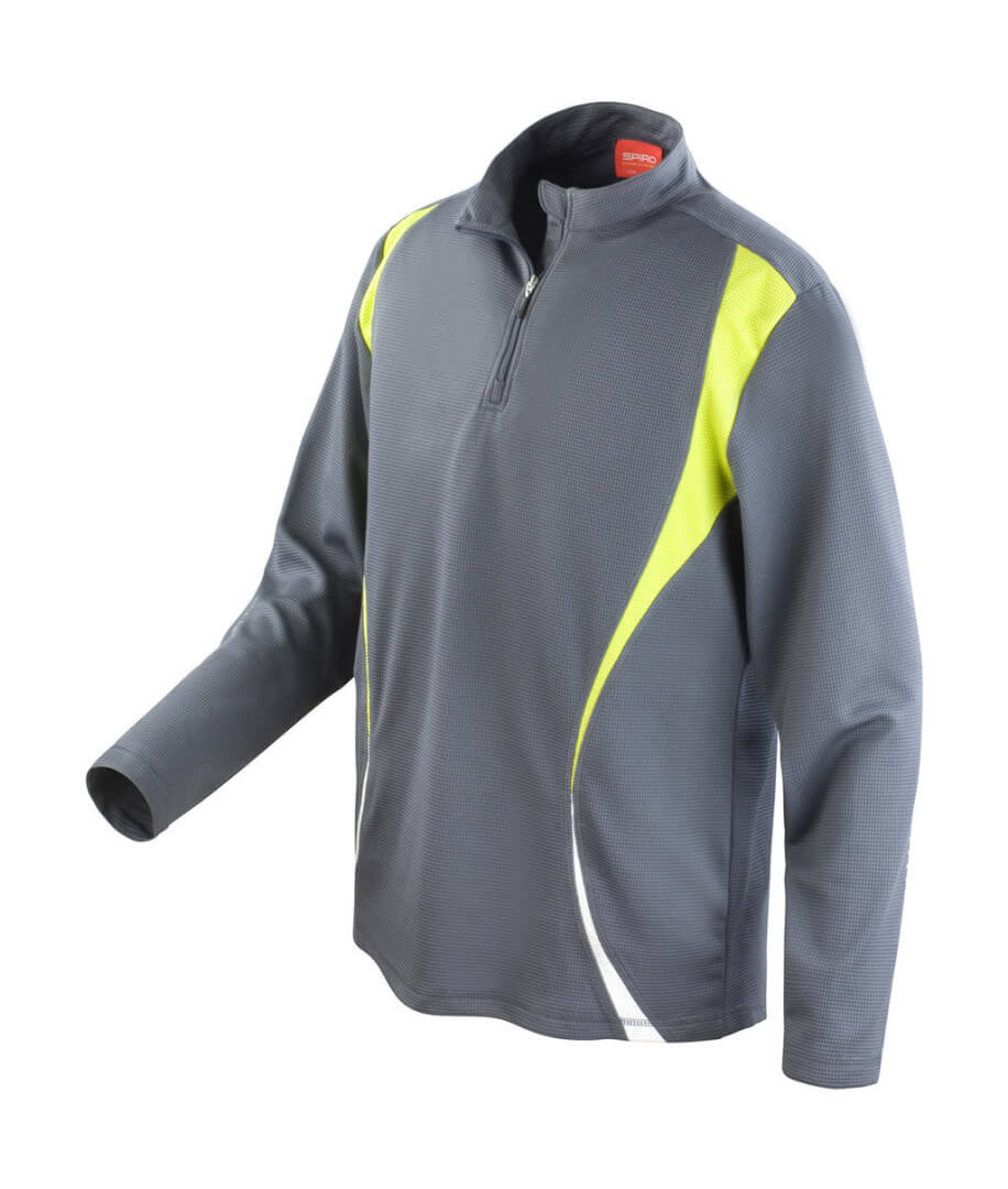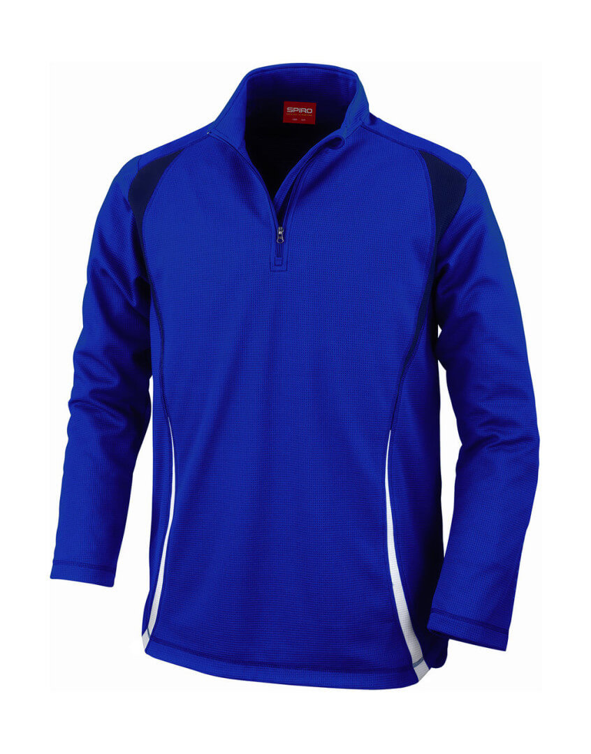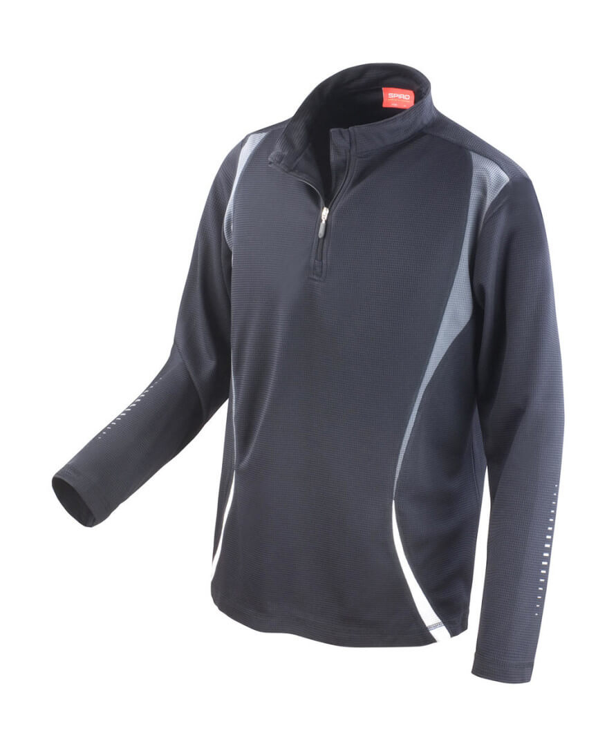 ·dlhé rukávy ·zdvihnutý golier ·krátky zips s ochranou na bradu ·vložky v kontrastných farbách vpredu a vzadu ·ozdobné pásy v dolnej časti rukávov ·ozdobné prešitie pri rukávoch a na dolnom okraji ·bočné švy ·